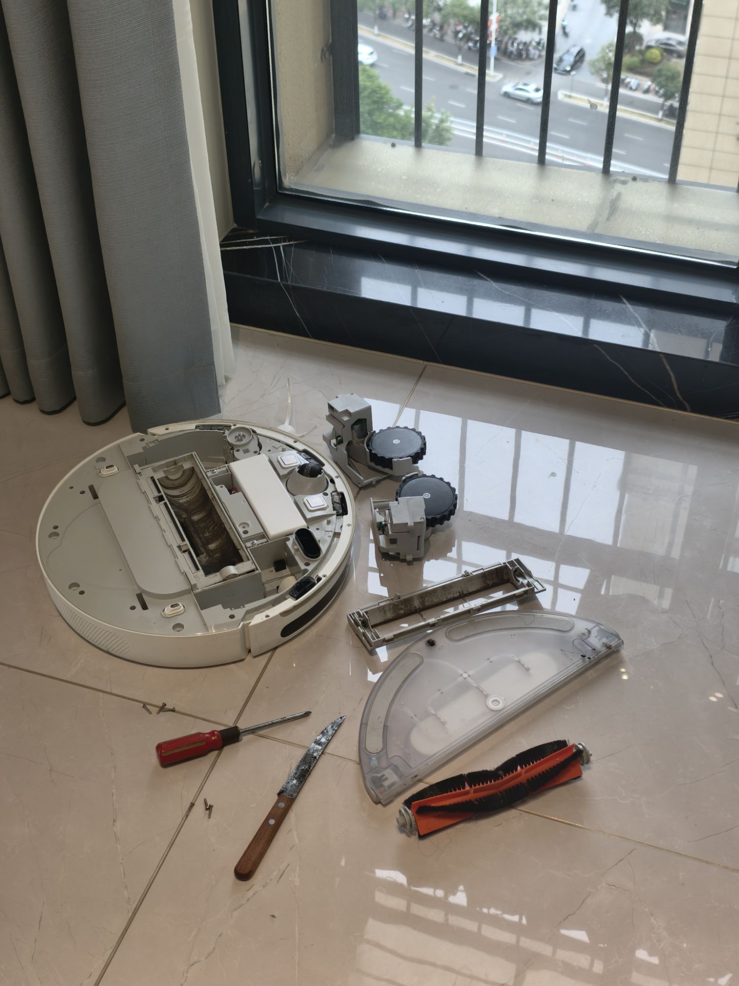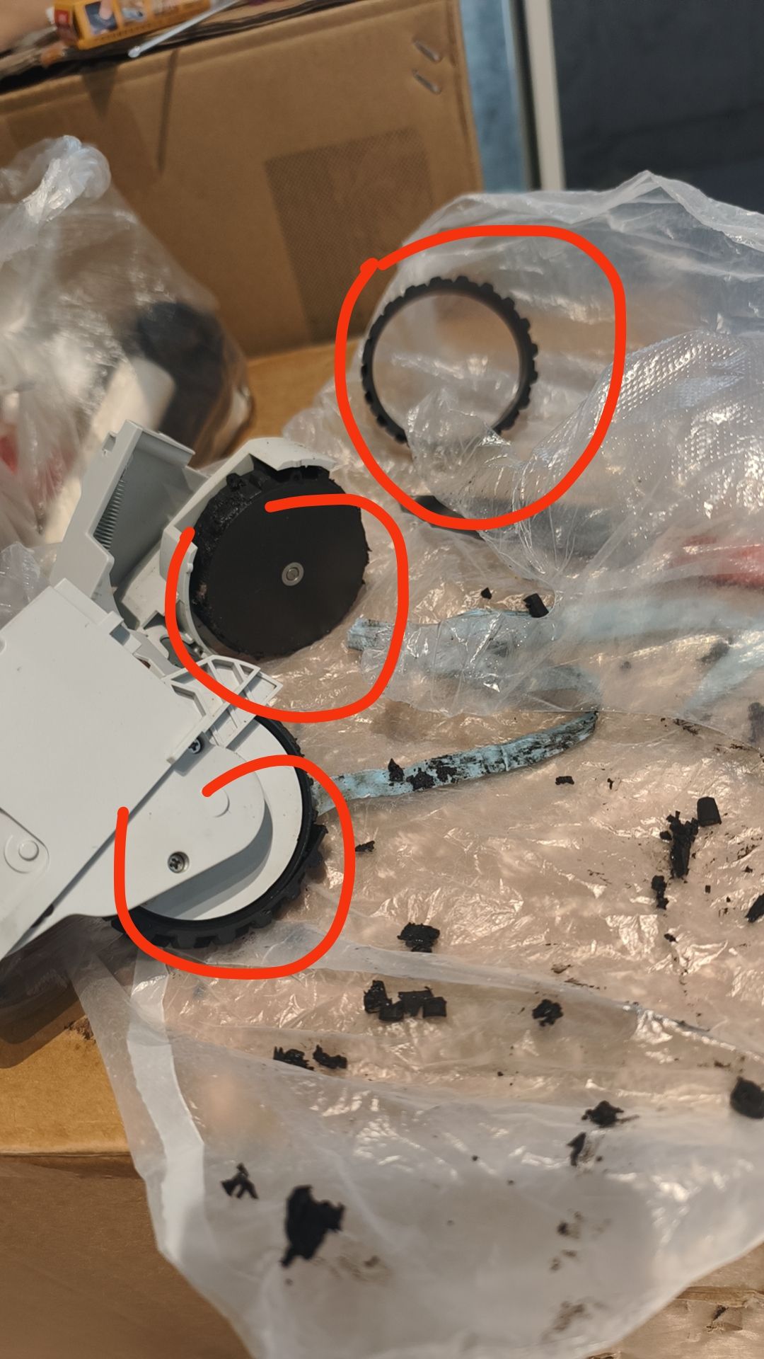 闲话就说到这,说说今天的正题。这次回老家,我顺带把扫地机器人带回来想用,结果刚拿起来,就发现它的轮胎大部分都结了泥块,地上还掉了一坨轮胎上的泥垢,特别难清理,而且两个滚刷也都坏了。还好淘宝上什么配件都有,我当即下单,准备自己动手维修。